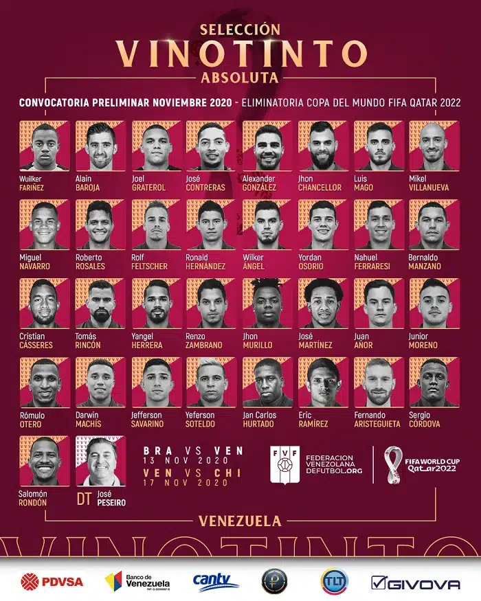 Através dos seus canais oficiais, a Venezuela informou sua lista de convocados para as duas próximas rodadas das Eliminatórias (Brasil no dia 13 de novembro em São Paulo e Chile no dia 17 do mesmo mês em Caracas) onde o treinador português José Peseiro optou por um chamado com mais nomes: 33.